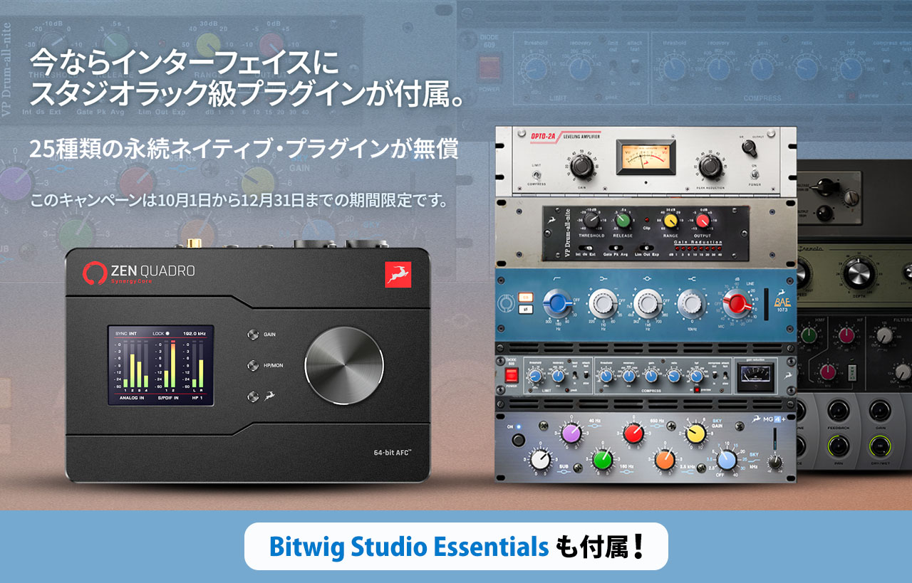 期間中対象商品ご購入で、90種以上のリアルタイムFXと60種以上のNative Pluginが9.99ドルで一年間使い放題!次世代DAW「Bitwig」のエントリーモデル「Bitwig Essentials」も付属!